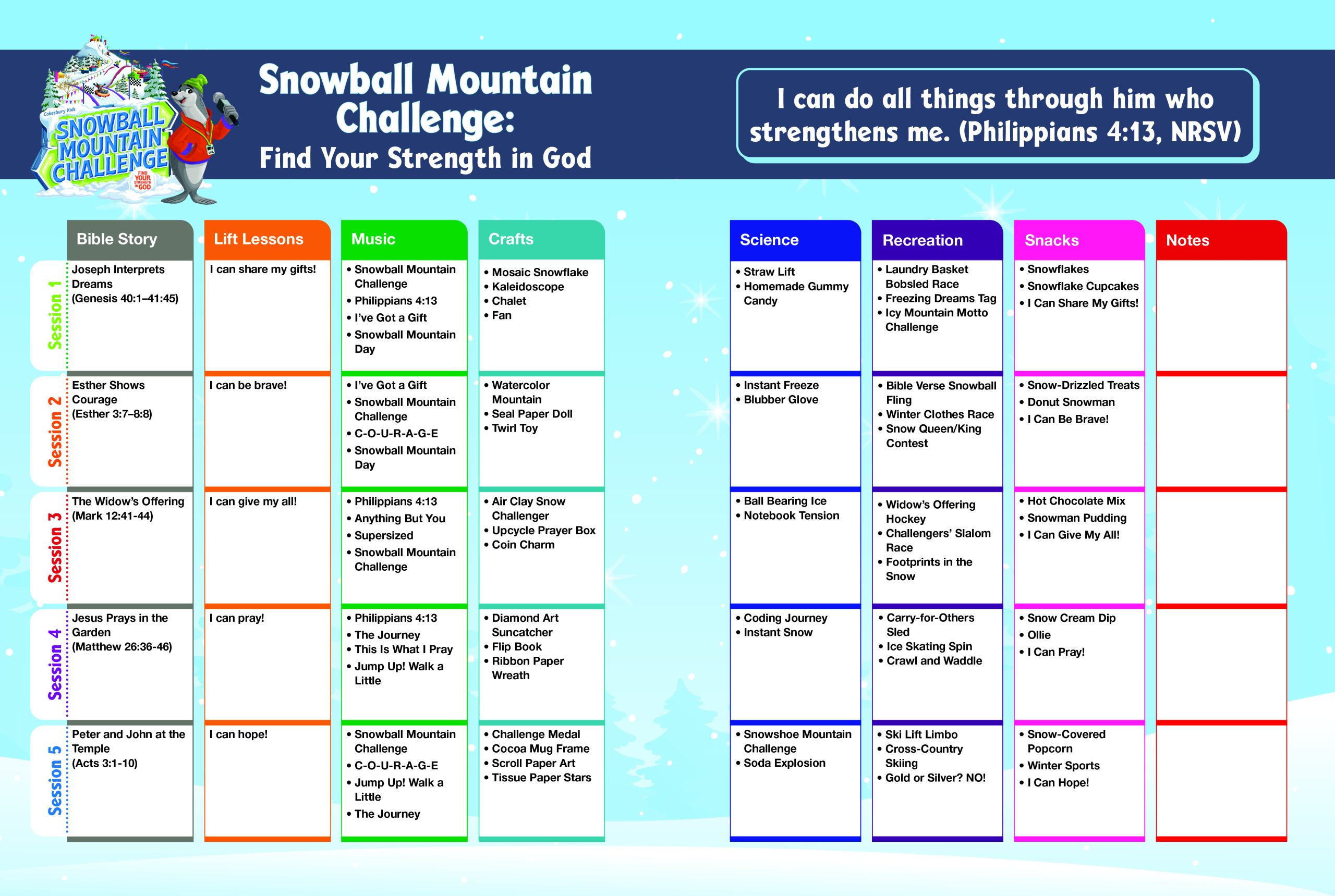 At Snowball Mountain Challenge VBS, your students will enjoy an interactive, energizing, Bible-based good time as they find their strength in God. They will become Challengers and discover how with God, they can do all things.
